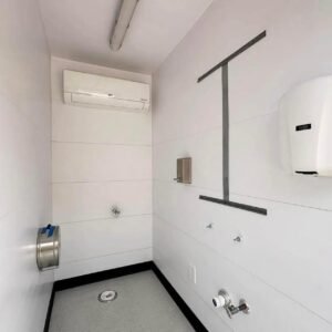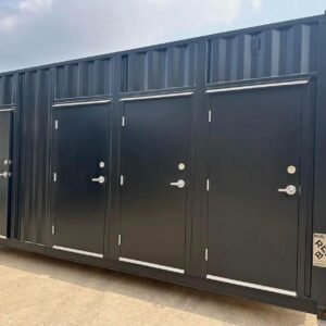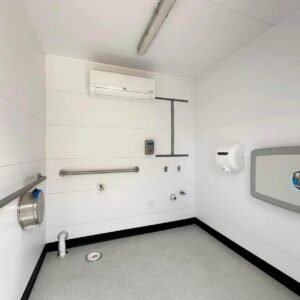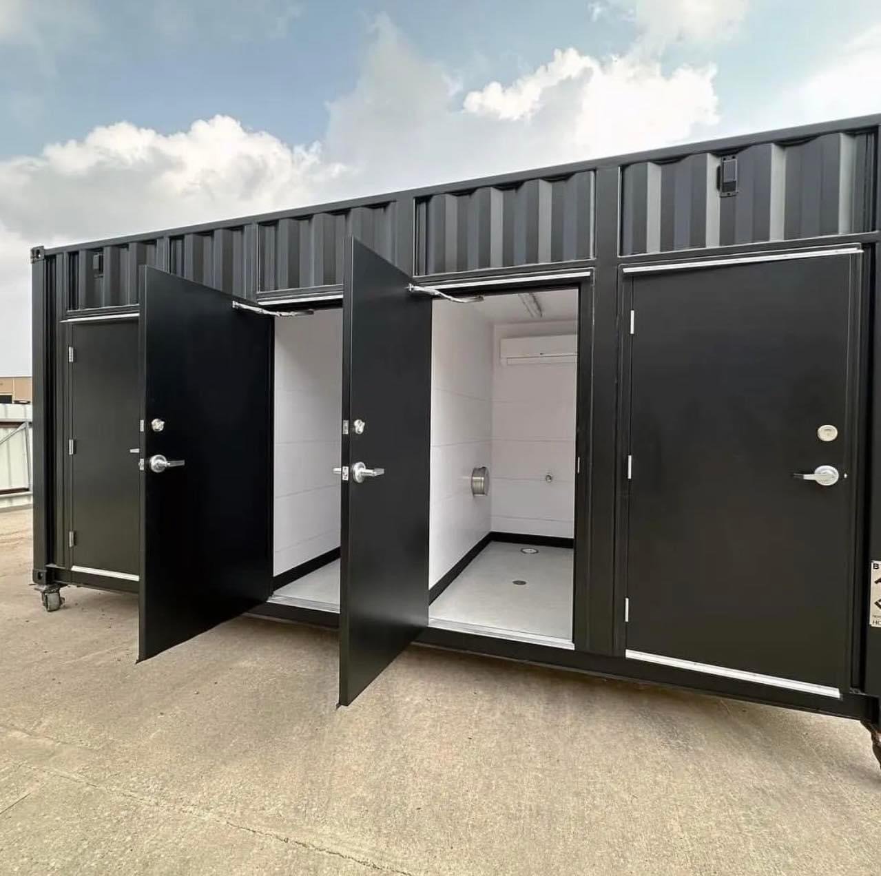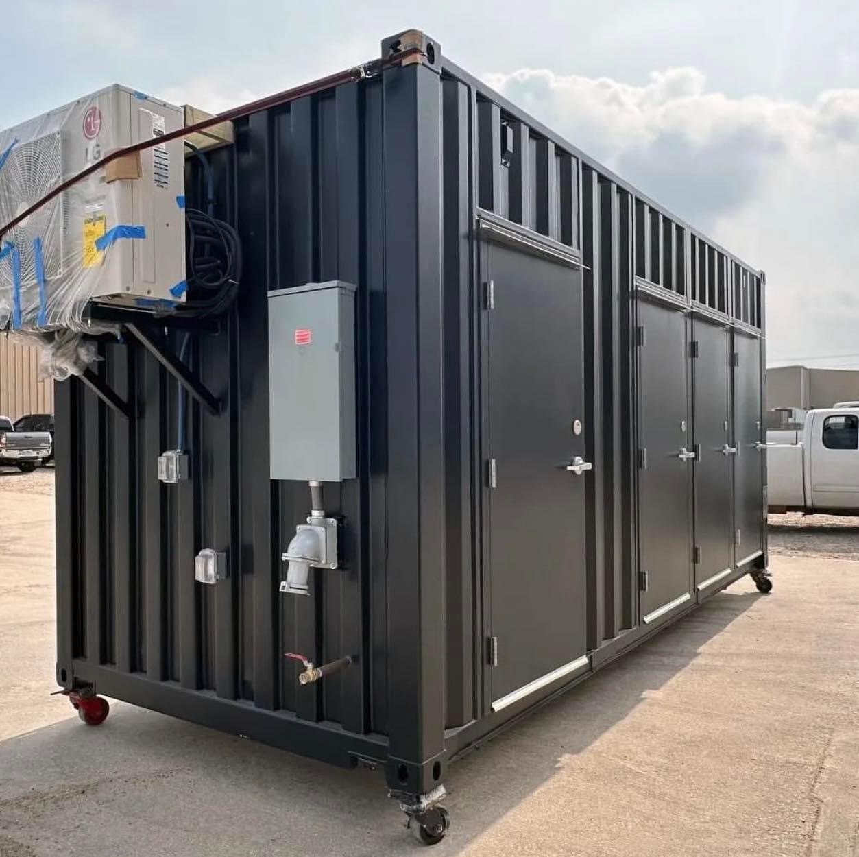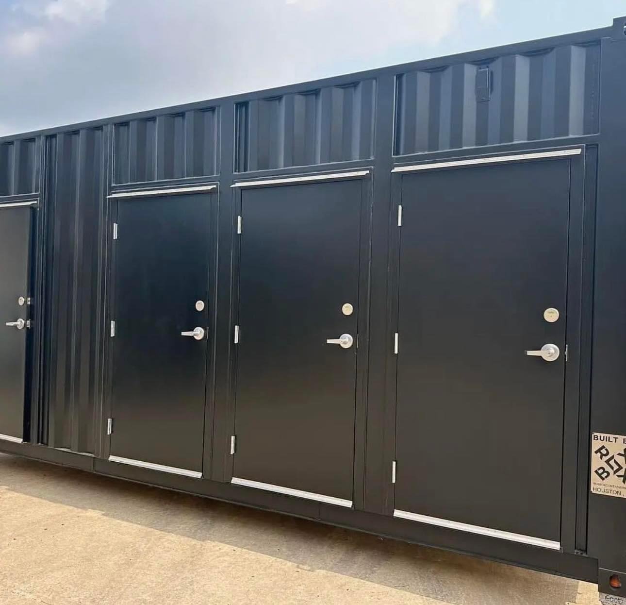 This modular restroom contains one ADA-compliant stall and three unisex stalls. This tankless bathroom will be connected to onsite utilities, is fully conditioned with HVAC, and is delivered turnkey. A custom vinyl wrap was added to the back of the unit to welcome guests to the client’s space. To learn more about the unit and check out more photos, view the project’s portfolio messaging our team Project Gallery page.